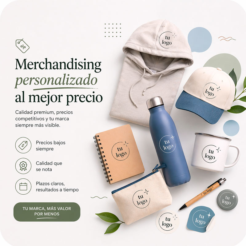 Merchandising personalizado para tu marca o evento. Crea productos únicos, prácticos y originales que reflejen tu estilo y sorprendan a tus clientes o invitados.