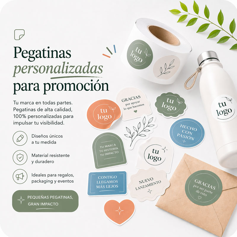 Disponemos de múltiples formatos, desde pegatinas de vinilo resistentes a la intemperie hasta pegatinas de papel para interiores, todas personalizables con tu logotipo, colores corporativos o diseño exclusivo. Son ideales para incluir en welcome packs, regalos promocionales o para distribuir en ferias y acciones de marketing.